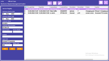 2. **Faulty Hardware Onboarding Module:** This module enables you to onboard faulty hardware efficiently and associate the hardware with the customer that brought it in for repair. It includes a service registry that records essential details such as the problem,Customer it belongs to, the spare part needed for repair, the cost of the spare part, the date when the hardware was brought in for repair, and the date when the repair was completed.
